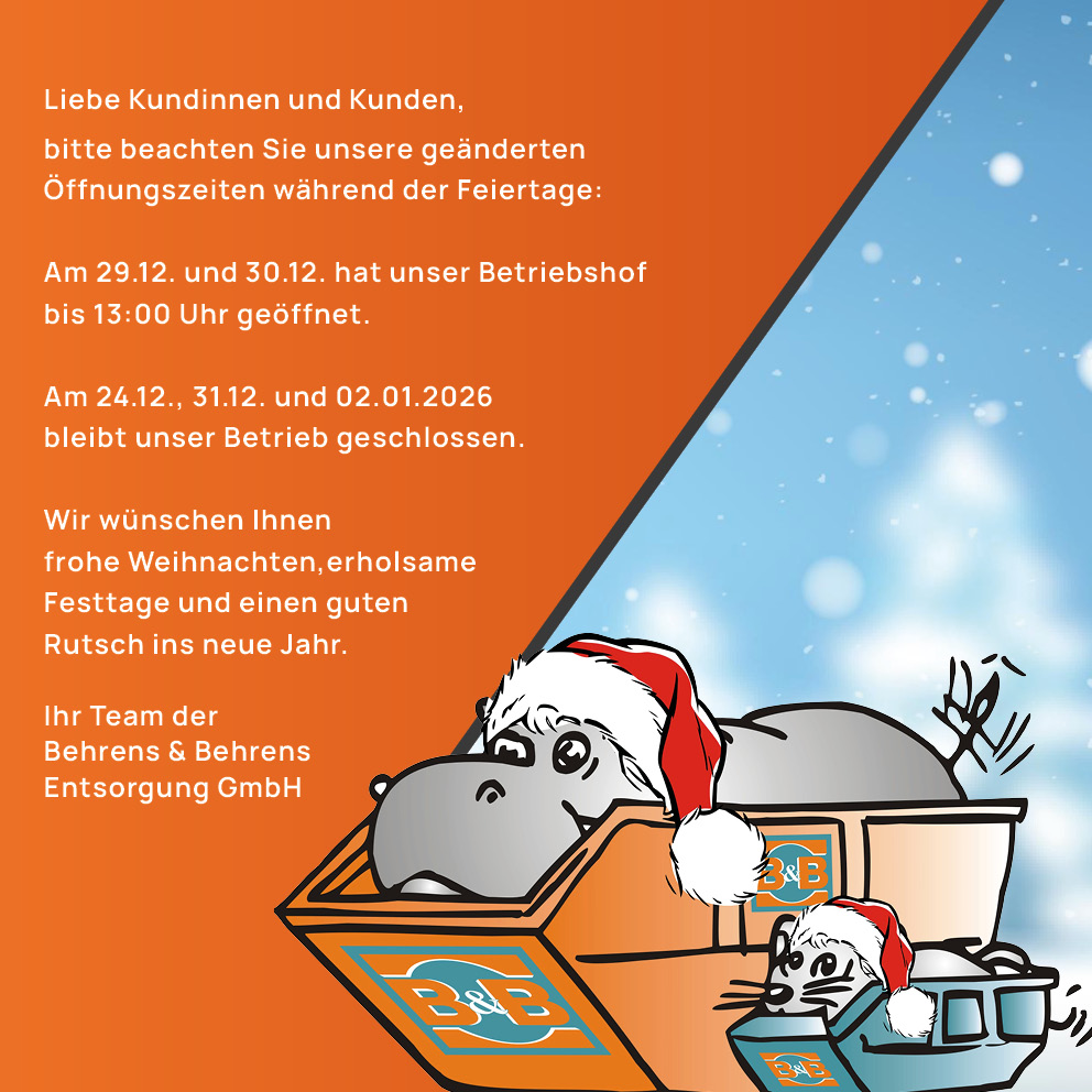 Behrens & Behrens mit Sitz in Scheeßel ist seit vielen Jahren Ihr kompetenter und zuverlässiger Partner bei der Entsorgung und Verwertung von Abfall und Wertstoffen im Landkreis Rotenburg (Wümme).