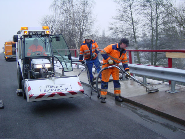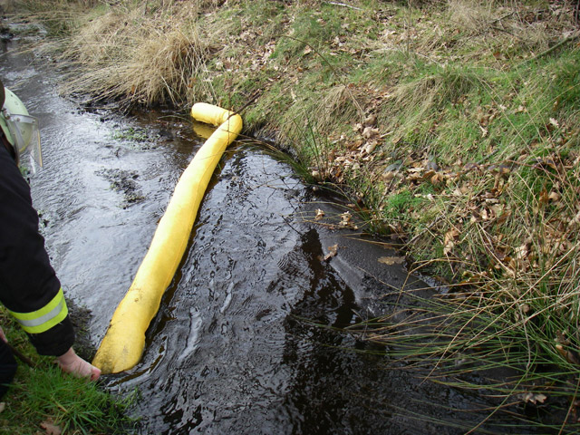 Bei Unfällen gelangen Betriebsstoffe oft über die Regenentwässerung der Verkehrsflächen in Vorfluter oder Rückhaltebecken. Hier ist dann ein schnelles Handeln gefordert. Absorbierende Ölsperren werden ausgelegt und anschließend werden die schwimmenden Betriebsstoffe abgesaugt.